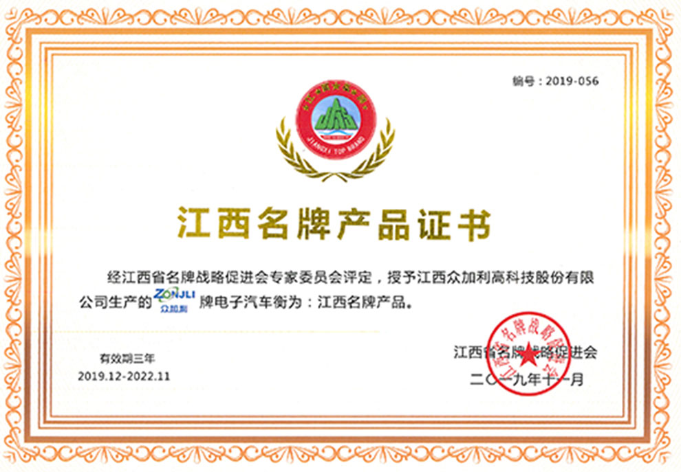 江西眾加利高科技股份有限公司汽車衡被授予江西名牌產(chǎn)品