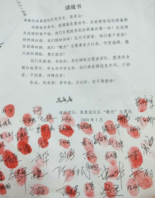 “作為黨員就要聽從組織號召,為社會做貢獻”。武紅娜家住槐蔭區(qū)綠地國際花都一區(qū),屬臘山街道辦事處泉景園社區(qū),她平時就熱愛公益活動,是社區(qū)志愿者群中的一員。正月初五,正是疫情最兇險的時刻,當她看到志愿者微信群里發(fā)布社區(qū)防疫召集志愿暑的動員令,就毫不猶豫地報了名,并在請戰(zhàn)書上鄭重地簽下了自己的名字。“疫情就是命令,疫情就是集結號,我們自愿挺身抗擊病毒的第一線!在疫情的特殊時間,我們隨時待命!在天災面前,我們毫不畏懼!在困難時期,我們微光志愿者全力以赴,聽黨指揮,服從組織調配,勇打勝仗!...... 我承諾:若有戰(zhàn),召必回,定不辱使命!”