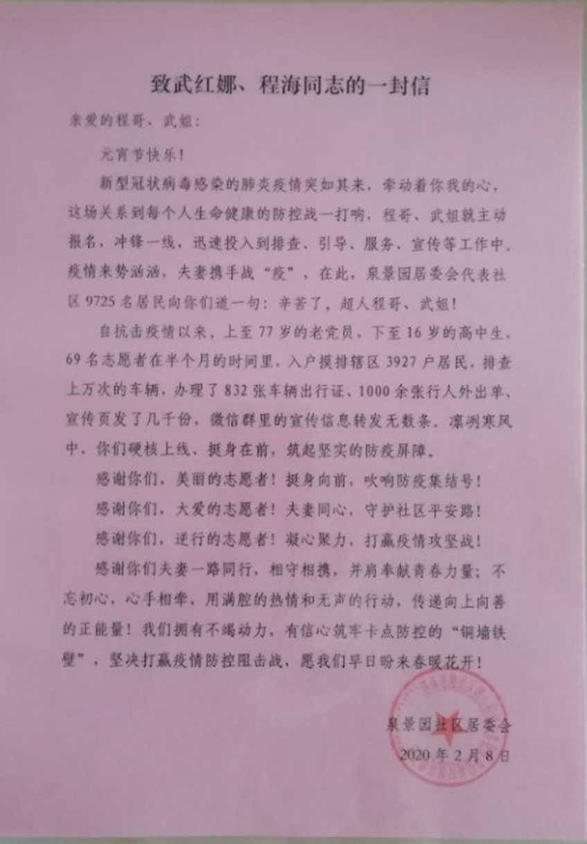 看著妻子為社區(qū)服務,武紅娜的丈夫程海也坐不住了,咱是男同志更應該為社區(qū)作貢獻,10歲的兒子也支持爸爸媽媽為社區(qū)服務,并保證一定要管好自己,認真完成作業(yè),不用爸媽操心自己。防疫初期工作量大,需要摸排居民信息,對進出車輛登記,他們所在的社區(qū)居民較多,為了織密防護網,武紅娜夫妻和志愿者們不厭其煩,一戶戶登記排查,不放過任何一位居民,為方便群眾為居民車輛辦理出行證,共登記了832張車輛出行證,辦理了1000余張居民出入證,宣傳頁發(fā)了幾千份,微信群里的宣傳信息不計其數(shù),在凜冽的寒風中,硬核上線、挺身在前,為社區(qū)筑起了堅實的防疫屏障。程海是男同志有力氣,他主動承擔防疫重活,每天一大早就背著消毒設備,對社區(qū)樓道、出入口、公共場所進行大范圍噴灑消毒,并參與門口執(zhí)勤、測溫工作。武紅娜在公司復工后,把自己的值勤時間安排到了下班后。就在前幾天,晚上9點了,正在武紅娜要交班的時候,有一輛車悄悄駛來,沒有進小區(qū),卻停了在路邊,她馬上前去詢問,是不是進小區(qū)的車,并耐心解釋路邊不能停車,但司機不聽勸阻,拒不開走,其他幾個志愿者聞訊趕來,勸阻無果。武紅娜果斷打了110,警察趕到后因其違章停車勸其駛離。當她拖著疲憊的身軀回到家的時候,已經11點了。戰(zhàn)“疫”不停,行動不止,用自己的實際行動踐行著初心和使命,堅定地站在疫情防控第一線,發(fā)揚不畏艱險、無私奉獻的精神,貢獻著自己的力量。夫妻攜手戰(zhàn)“疫”,2月8日,居委會寫來感謝信,代表泉景園居委會9725名居民向他們說了一句肺腑之言,“辛苦了,超人武姐、程哥”。