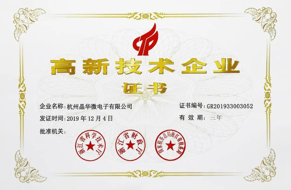 杭州晶華微電子有限公司再次獲評(píng)“高新技術(shù)企業(yè)”